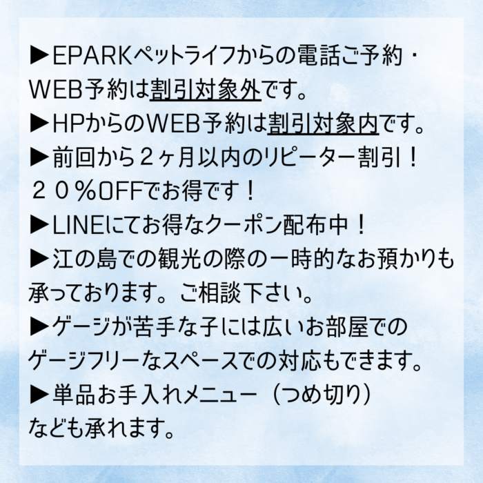 完全予約制で1頭1頭に寄り添う時間を十分に設け、ワンちゃんと飼い主さまにご満足いただけるトリミングを心掛けております。江の島観光の際、一時的なお預かり、単品お手入れなど承っております。